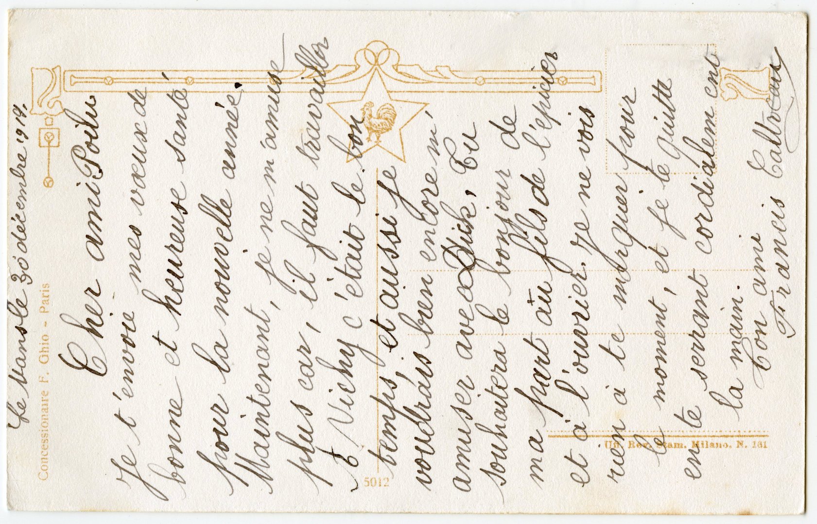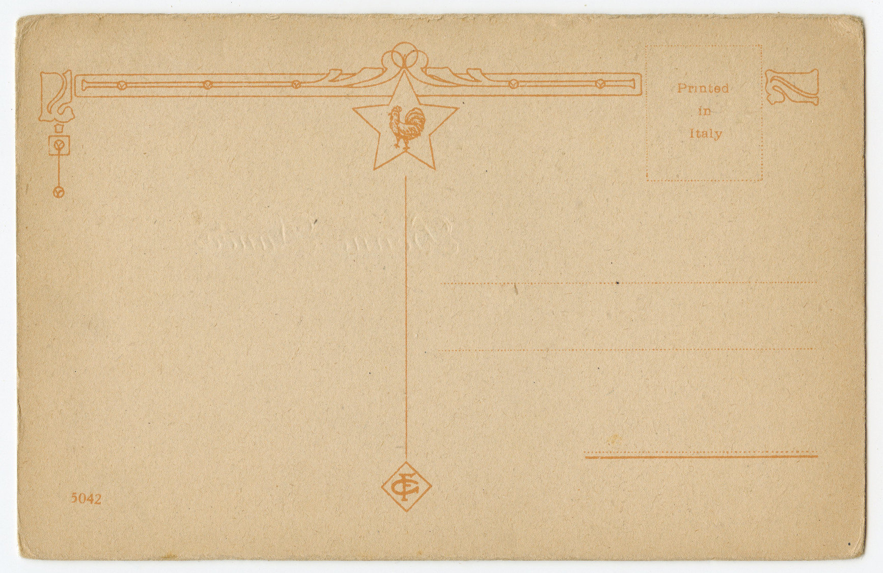 He acted as an agent for Italian cards bearing the cockerel logo, see card 5012. Later ones don't have his name but a logo, the monogram FG (which can look rather like FC), see card 5042. (This was very yellowed with age, I have restored the image of the face to something like its original appearance.) There is a separate entry here for cards with the logo of a cockerel in a star.