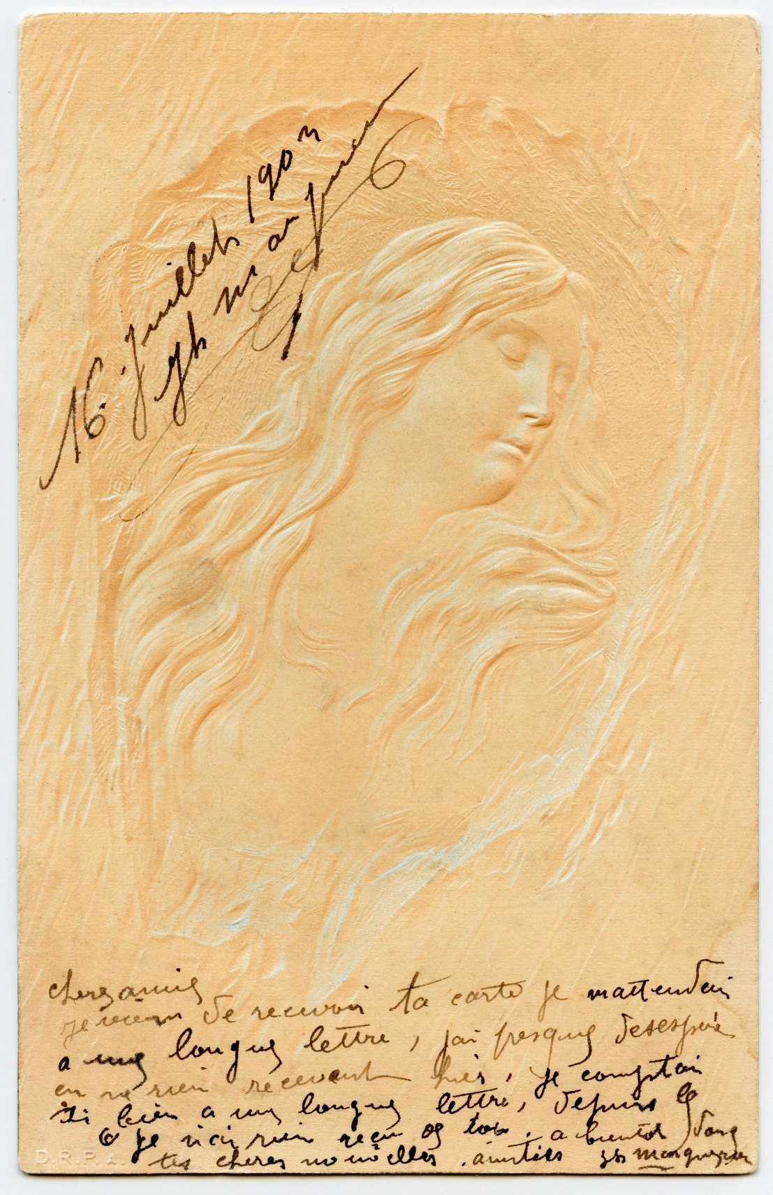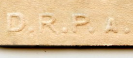 I don't know what the A is, but D.R.P. = Deutsches Reichspatent and will refer to the process used in embossing the cards.