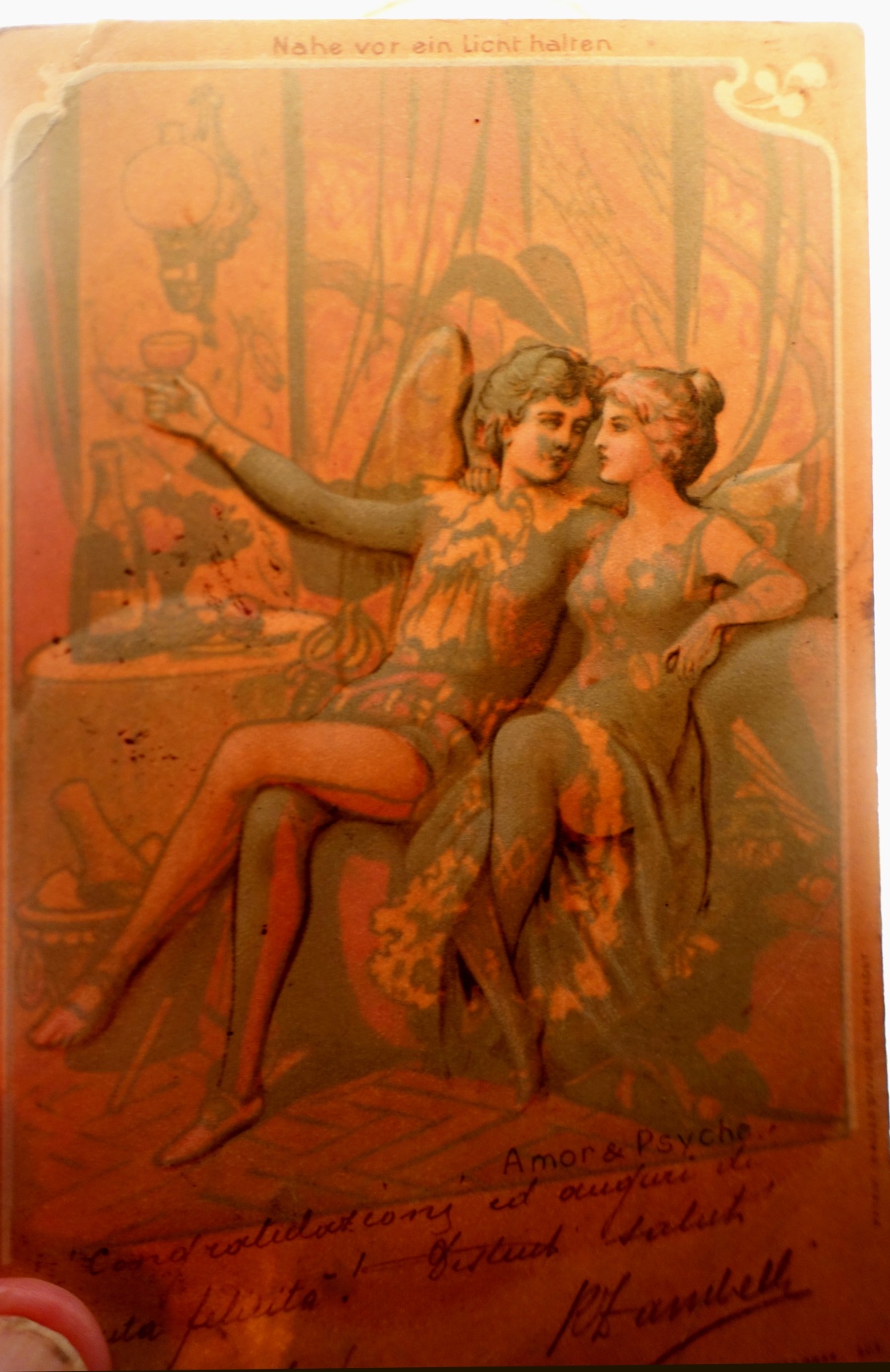 article in TPA), stars of the time in statue form (as the first example card) or buildings in the above areas (second example). As well as cards bearing the legend as in the heading (the second example), there are cards with this plus the name of another publisher (eg A Socki Wien), cards like the first example with just a logo, and cards bearing no legend at all. The similarity of detail including the kinds of borders on some of the cards, the dates and and the likely complexity of the manufacturing make it likely that the cards were all actually made by the same firm. As Kunstanstalt "Kosmos" also produced non hold-to-light cards, that firm may be just one of the publishers commissioning hold--to-light cards from the actual manufacturer.