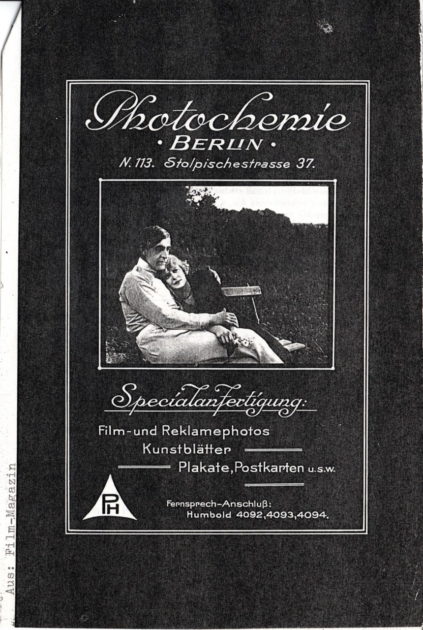 The PH logo was used on the modelled pictures of ladies, couples, children etc.from 1907 or a bit earlier. Photochemie also produced an extensive series of German film stars 1914-1919, though these use the company name rather than the logo. These can be seen in the Image Archive section of the Ross postcards site.