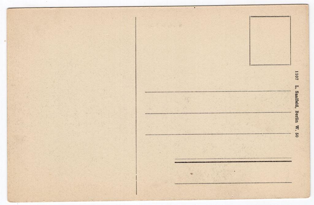 Saalfeld cards are generally city views in and around Berlin. Dates range late 1890s-1920. The early cards have a logo L.S. above B in a shield, but also have the name (rather indistinct on the example card) up the side.